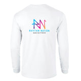 Relax in your very own Rhythm Nation Dance & Fitness long sleeve T-Shirt, available in black or white with Rhythm Nation logo on the Back.